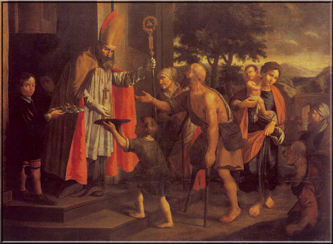 St. Nicholas, this great servant of God, whom St. Peter Damian calls the one chosen of God from his mother's bosom, the ward of sanctity in childhood, the beauty of the young men, the honor of the old, the splendor of the priests, and the light of the bishops, was born at Patara in Lycia in 280, or rather was then presented by God, in answer to their prayers, to his pious childless parents. Even as an infant he would abstain on Wednesdays and Fridays (the fastdays of that time) from his mother's milk, and during his whole life continued to fast on these days. He passed through his childhood free from all levity, and in such innocence and piety, that he could serve every one as a pattern of sanctity. The early death of his parents left him the heir to great wealth, whuch he distributed to the poor, that is, to those who were ashamed to beg, and gave the most to those whose poverty most endangered their salvation. This is illustrated in the fallowing story: